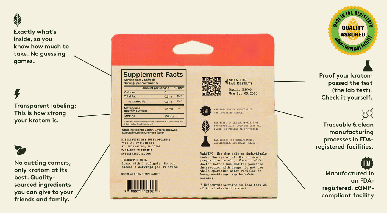 Super Speciosa ensures quality through traceable sourcing and rigorous lab testing for safety, strength, and purity, including heavy metals and contaminants. These soft gels are produced in a GMP-compliant and FDA-registered facility.
